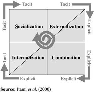 จะเห็นได้ว่า ความรู้ประเภทที่สองไม่น่าจะเป็นปัญหาในวงการวิชาชีพครู แต่เจ้า Tacit Knowledge นี่สิ หากข้าราชการครูผู้เชี่ยวชาญจริง แม้ไม่มีวิทยฐานะเชี่ยวชาญก็ตาม ได้เกษียณหรือเออรี่รีไทน์ไปแล้ว ย่อมสูญหายไปอย่างน่าเสียดาย ดังนั้นจำเป็นอย่างยิ่งที่เราต้องรีบทำการดักจับ หรือเก็บความรู้ที่มีอยู่ในบุคคลเหล่านี้ไว้ในระบบสารสนเทศผ่านกระบวนการทางสังคมที่ถูกต้อง ซึ่งวิธีการที่เรียกว่า SECI Model ของ Nanoka น่าจะเป็นวิธีที่ดีวิธีหนึ่ง โดยมีความหมายดังนี้